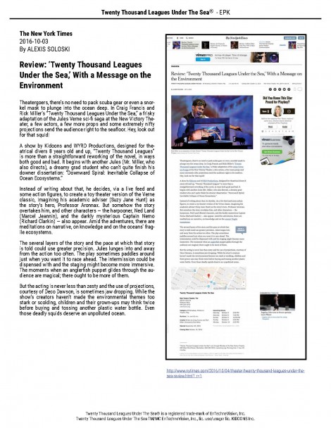 Theatergoers, there’s no need to pack scuba gear or even a snorkel mask to plunge into the ocean deep. In Craig Francis and Rick Miller’s “Twenty Thousand Leagues Under the Sea,” a frisky adaptation of the Jules Verne sci-fi saga at the New Victory Theater, a few actors, a few more props and some extremely nifty projections send the audience right to the seafl oor. Hey, look out for that squid!