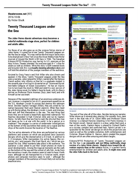 For those of us who grew up on the science fi ction stories of Jules Verne, it is great fun to see Twenty Thousand Leagues under the Sea on stage. This may well be the fi rst major Verne story to be dramatized in New York since the Orson Welles/Cole Porter musical of Around the World in 80 Days in 1946. The Canadian Kidoons/WYRD Production now having its U.S. premiere at the New Victory Theater intended “for everyone ages 8 +” is fi ne for adults as well as children. While the story is both watered down and leisurely told, this is a visually stunning adventure story and will hold the attention of the younger members of the audience.