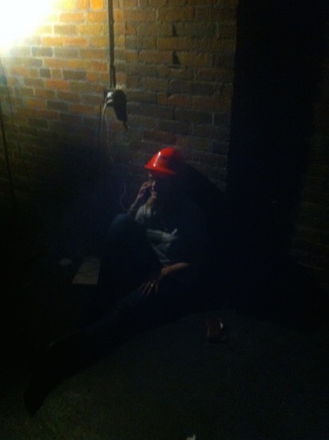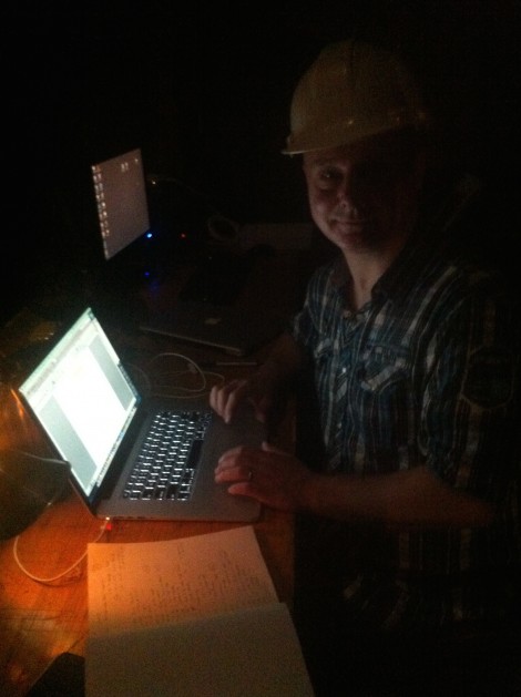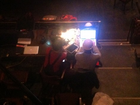1) Craig Francis here, doing some rewriting on the play after our actors' read-through... while lights being hung above my head!