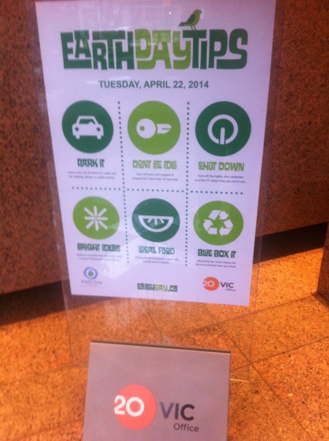 Spotted in the lobby of TO VIC office tower in Toronto yesterday on the way back from workshopping the production of Twenty Thousand Leagues Under The Sea. Congratulations to our friends at Earth Day Canada for getting the good word out.