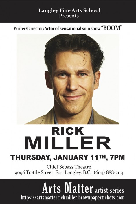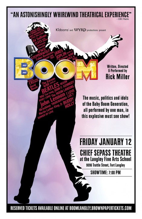 Friday, January 11 – BOOM- at the Chief Sepass Theatre at the Langley Fine Arts School. Rick Miller will be presenting BOOM at the Chief Sepass Theatre located in Fort Langley. If you have yet to see BOOM, you won’t want to miss your chance to catch this astonishingly whirlwind theatrical experience featuring the music, politics and idols of the baby boom generation, all performed by one man, Rick Miller.