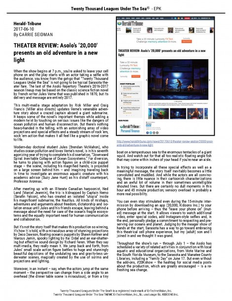 When the show begins at 7 p.m., you’re asked to leave your cell phone on and the play starts with an actor taking a selfi e with the audience, you know from the get-go that “Twenty Thousand Leagues Under the Sea” is not going to be typical Sarasota theater fare. The last of the Asolo Repertory Theatre’s 2016-2017 season lineup may be based on the classic science fi ction novel by French writer Jules Verne that was published in 1870, but its delivery and message are entirely 2017.
