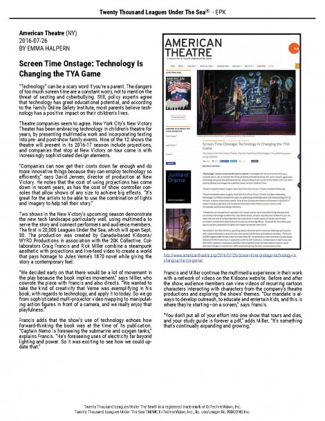Theatre companies seem to agree. New York City’s New Victory Theater has been embracing technology in children’s theatre for years, by presenting multimedia work and incorporating textinginto pre- and post-show family events. Nine of the 12 shows the theatre will present in its 2016-17 season include projections, and companies that stop at New Victory on tour come in with increasingly sophisticated design elements.