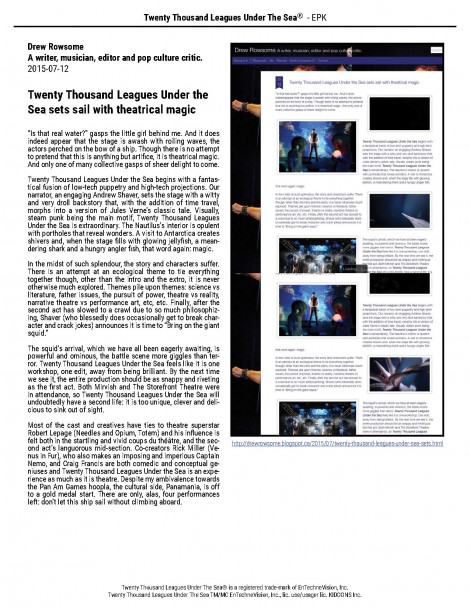Twenty Thousand Leagues Under the Sea begins with a fantastical fusion of low-tech puppetry and high-tech projections. Our narrator, an engaging Andrew Shaver, sets the stage with a witty and very droll backstory that, with the addition of time travel, morphs into a version of Jules Verne’s classic tale. Visually, steam punk being the main motif, Twenty Thousand Leagues Under the Sea is extraordinary. The Nautilus’s interior is opulent with portholes that reveal wonders. A visit to Antarctica creates shivers and, when the stage fi lls with glowing jellyfi sh, a meandering shark and a hungry angler fi sh, that word again: magic.