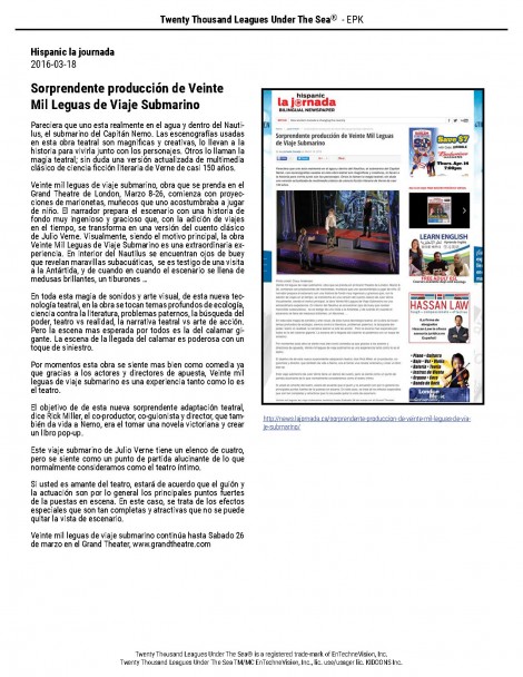 Pareciera que uno esta realmente en el agua y dentro del Nautilus, el submarino del Capitán Nemo. Las escenografías usadas en esta obra teatral son magnifi cas y creativas, lo llevan a la historia para vivirla junto con los personajes. Otros lo llaman la magia teatral; sin duda una versión actualizada de multimedia clásico de ciencia fi cción literaria de Verne de casi 150 años.